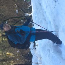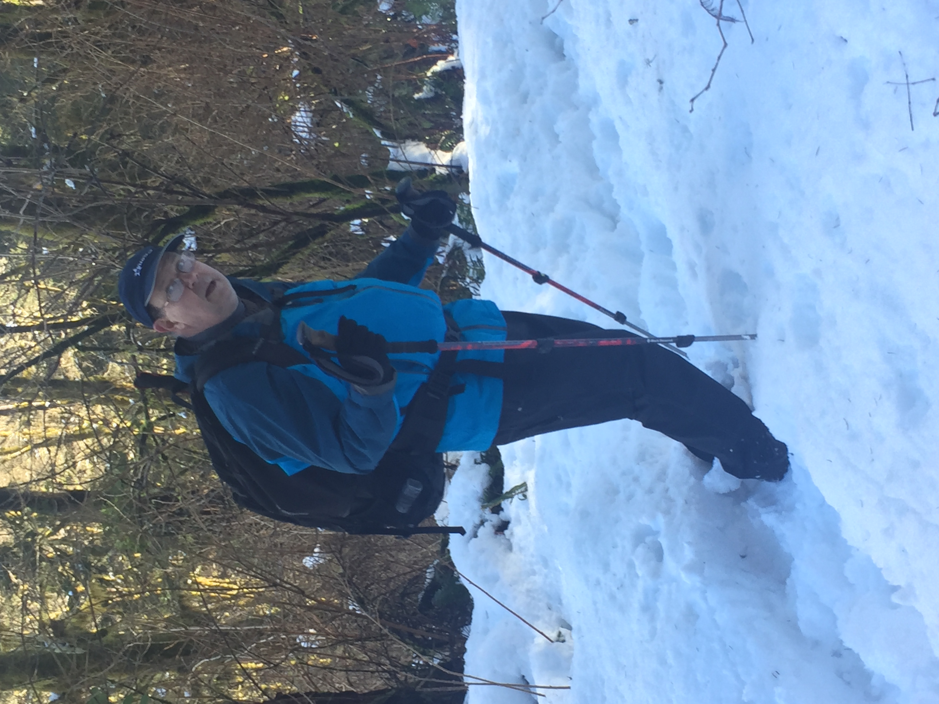 This activation date provided a big surprise. The summit is several miles north of Florence and back from the ocean a few miles. I ordinarily would not expect much snow. However, by the time we arrived at the trailhead, the parking lot had about six inches of snow. We headed up the trail, without snowshoes. I didn't even have boots - just waterproof low cut hiking shoes.
