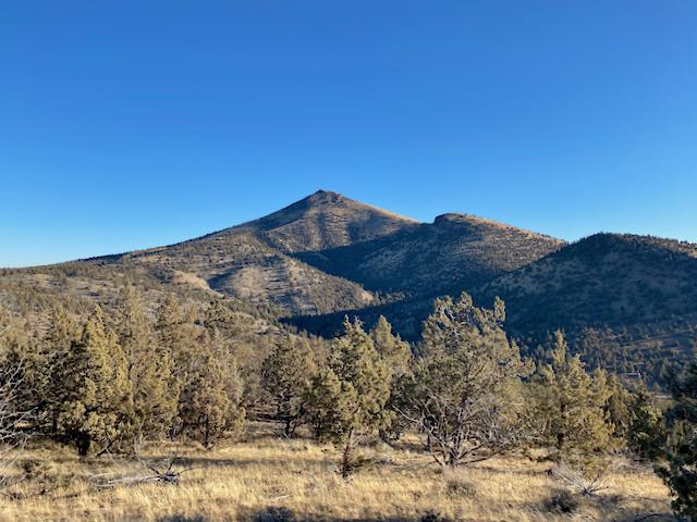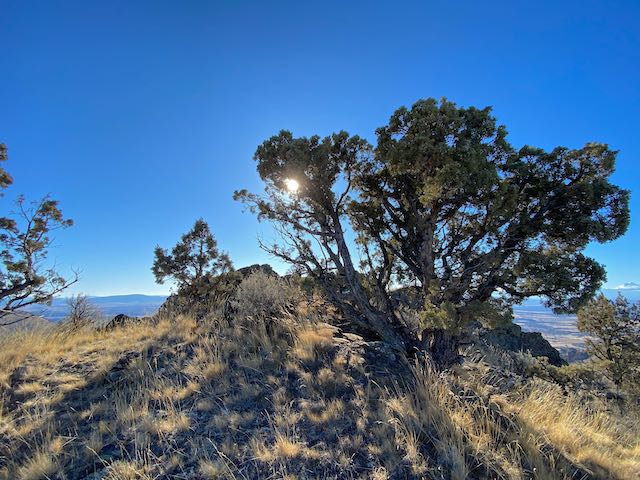 From April 1 to September 30 there’s a secondary forest road, NF5730, you can drive south from NF57 to the base of the mountain. This is the shortest approach with a hike of about a mile and 600-foot climb. Outside this seasonal window a gate blocks NF5730 at NF57. This is what I encountered. From the gate to summit it’s about 2.4 miles, mostly walking along the closed road until you get back to the base of the mountain. You’ll find that cross country hiking in this area is easy as it’s an open juniper grassland.