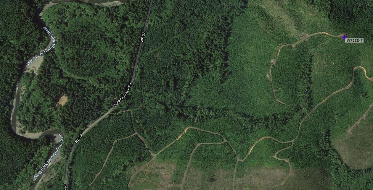 After failed attempts at Burnt Hill [W7W/NO-108] and Display Mountain [W7W/SO-105], I drove down Donkey Creek Road east of Highway 101 to a spot where the satellite views from Google Maps and AllTrails.com show a road splitting off to the east [47.303033, -123.834128].