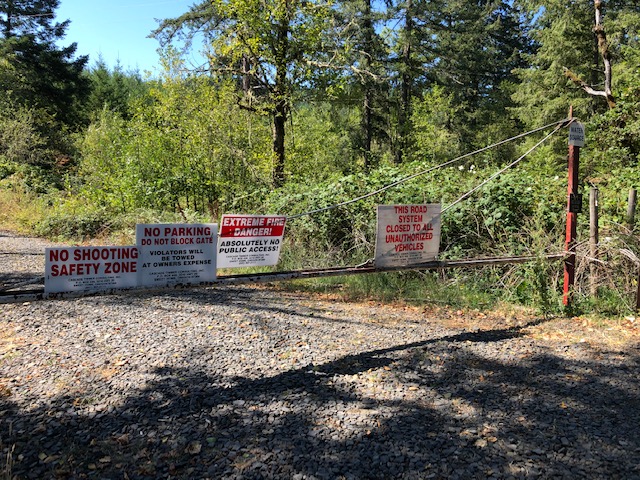 There is a Locked Gate and currently Posted Extreme Fire Danger No Public Access Sign where the route turns left off Mountain Home Drive (see blue dot). At that point the road is gravel up to Scott Mountain summit. I came in from Highway 20 to Liberty Road to Mountain Home Drive. The Property is posted by Cascade Timber out of Sweet Home. Once the fire danger has been removed you can access the summit but it about a 2 mile hike up as no unauthorized vehicles are allowed.