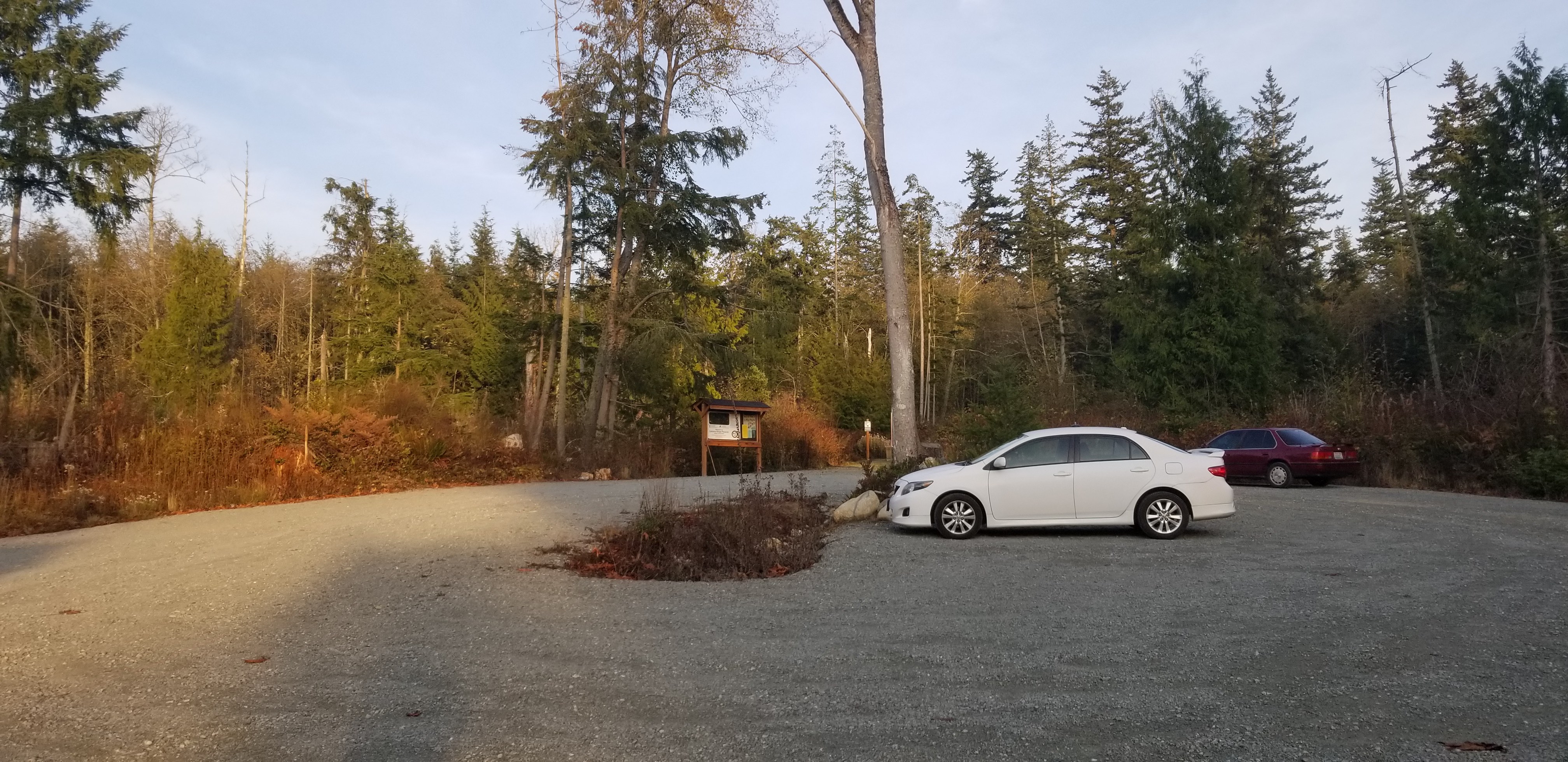 From I-5, take Exit 212 for WA-532 toward Camano Island/Stanwood.  Turn left onto WA-532, and continue for 10.1 miles.  The road will veer left and turn into NE Camano Dr for another mile.  Turn right onto E Cross Island Rd, and continue for 1.9 miles.  Turn left onto N Camano Ridge Rd, and parking will be on the left in 0.9miles.  It's easy to miss, and I drove by the first time.