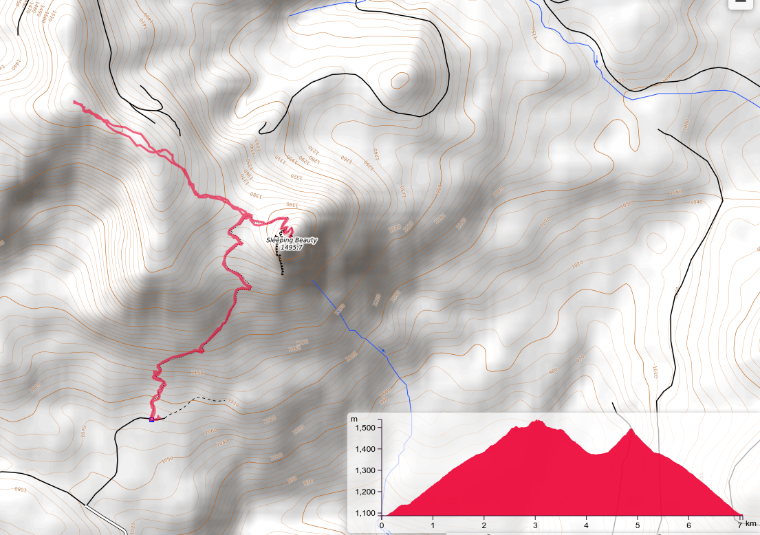 Looks like there may be a shorter bushwhack from the north when examining the map. However, I was invited to hike Sleeping Beauty by some friends. Answering the question why isn’t Sleeping Beauty a SOTA summit leads you to Peak 5060, which has the required promonance.