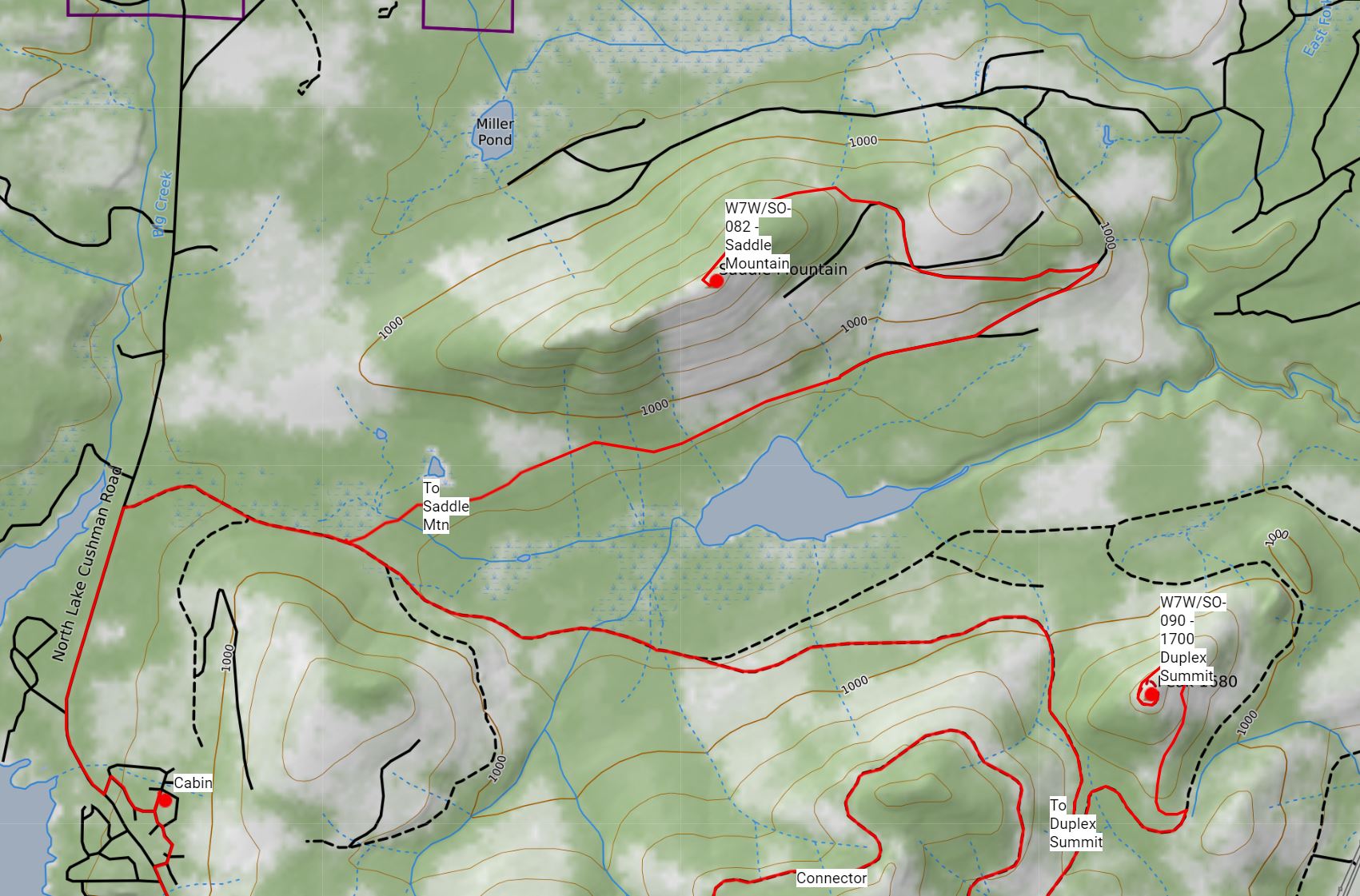 I also went up on Saddle Mtn. to scout it out - I was planning to activate the next day. Once I was there I figured I'd give it a shot with my H/T (the only radio I had with me), and I was pleased to make contact with several of our W7W regulars. It was raining heavily, so I didn't linger very long. I did come back to this area the next day (with HF gear) to activate two more summits. See trip reports for Duplex Summit and Dow Mtn. All three are do-able in one day.
